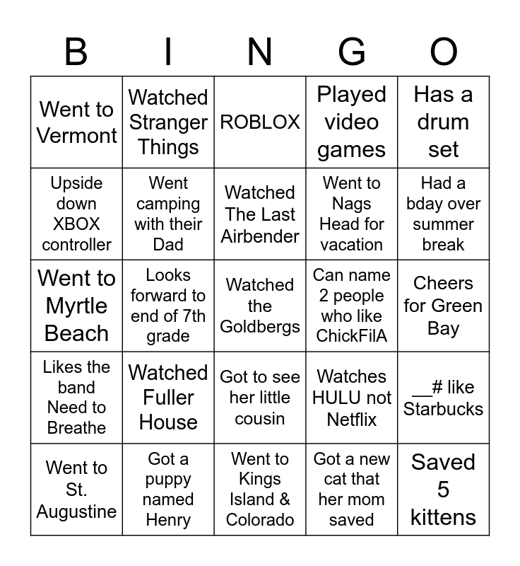 This bingo card has 25 words: Watched Fuller House, Went to Kings Island & Colorado, Watched The Last Airbender, Went to St. Augustine, Has a drum set, Went to Vermont, Upside down XBOX controller, Watched Stranger Things, Can name 2 people who like ChickFilA, Got to see her little cousin, Went to Nags Head for vacation, Went to Myrtle Beach, Watches HULU not Netflix, __# like Starbucks, Went camping with their Dad, Saved 5 kittens, Cheers for Green Bay, ROBLOX, Had a bday over summer break, Looks forward to end of 7th grade, Watched the Goldbergs, Got a puppy named Henry, Likes the band Need to Breathe, Played video games and Got a new cat that her mom saved.