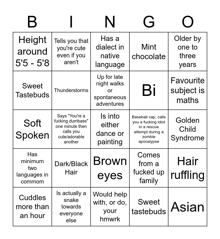 This bingo card has 25 words: Dark/Black Hair, Would help with, or do, your hmwrk, Up for late night walks or spontaneous adventures, Cuddles more than an hour, Older by one to three years, Height around 5'5 - 5'8, Sweet Tastebuds, Tells you that you're cute even if you aren't, Baseball cap, calls you a fucking idiot in a rescue attempt during a zombie apocalypse, Brown eyes, Bi, Soft Spoken, Comes from a fucked up family, Hair ruffling, Thunderstorms, Asian, Golden Child Syndrome, Has a dialect in native language, Favourite subject is maths, Says "You're a fucking dumbass" one minute then calls you cute/adorable another, Is into either dance or painting, Is actually a snake towards everyone else, Has minimum two languages in commom, Mint chocolate and Sweet tastebuds.