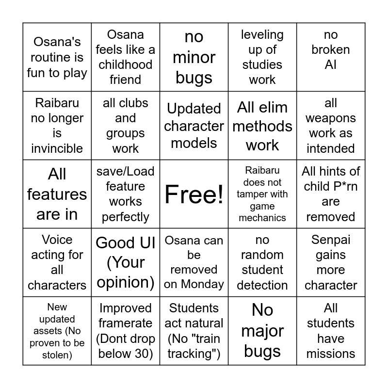 This bingo card has a free space and 24 words: Good UI (Your opinion), Improved framerate (Dont drop below 30), Updated character models, New updated assets (No proven to be stolen), no broken AI, Osana's routine is fun to play, Raibaru no longer is invincible, Osana feels like a childhood friend, Raibaru does not tamper with game mechanics, Osana can be removed on Monday, All elim methods work, All features are in, no random student detection, Senpai gains more character, all clubs and groups work, No major bugs, All hints of child P*rn are removed, no minor bugs, all weapons work as intended, save/Load feature works perfectly, All students have missions, Voice acting for all characters, leveling up of studies work and Students act natural (No "train tracking").