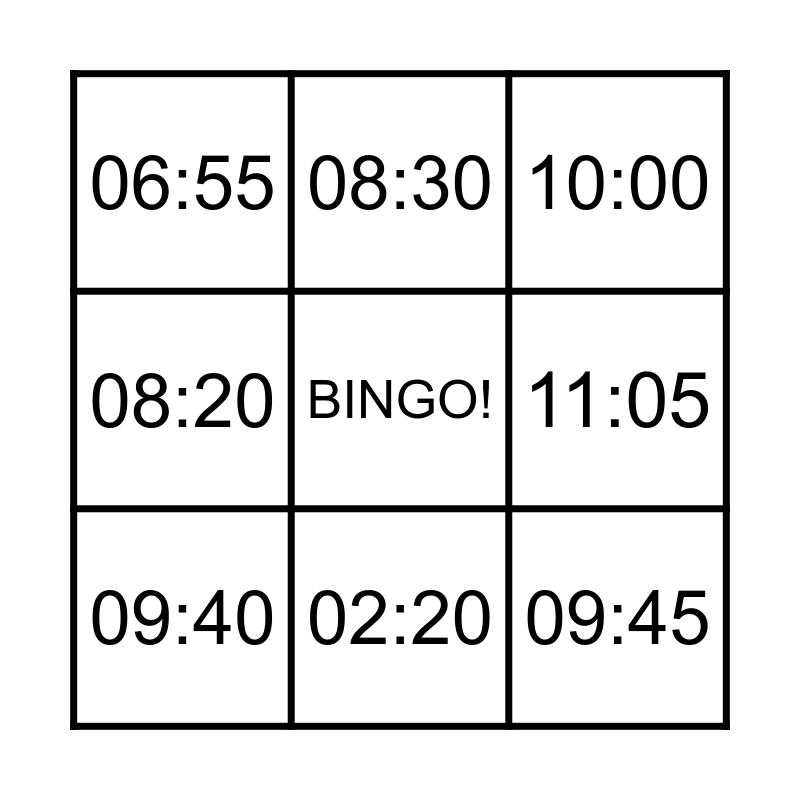 This bingo card has a free space and 20 words: 11:30, 07:50, 10:00, 08:05, 01:10, 09:45, 05:15, 06:55, 12:00, 08:30, 07:30, 01:45, 11:05, 07:55, 09:40, 07:40, 02:20, 08:20, 10:25 and 12:25.