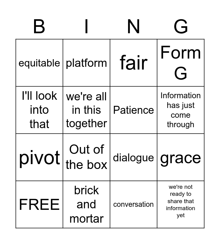 This bingo card has 16 words: brick and mortar, grace, fair, equitable, pivot, platform, dialogue, conversation, I'll look into that, we're all in this together, FREE, Form G, Out of the box, Information has just come through, Patience and we're not ready to share that information yet.