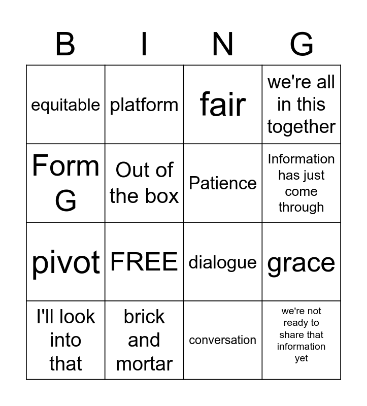 This bingo card has 16 words: brick and mortar, grace, fair, equitable, pivot, platform, dialogue, conversation, Form G, Out of the box, I'll look into that, we're all in this together, FREE, Information has just come through, Patience and we're not ready to share that information yet.