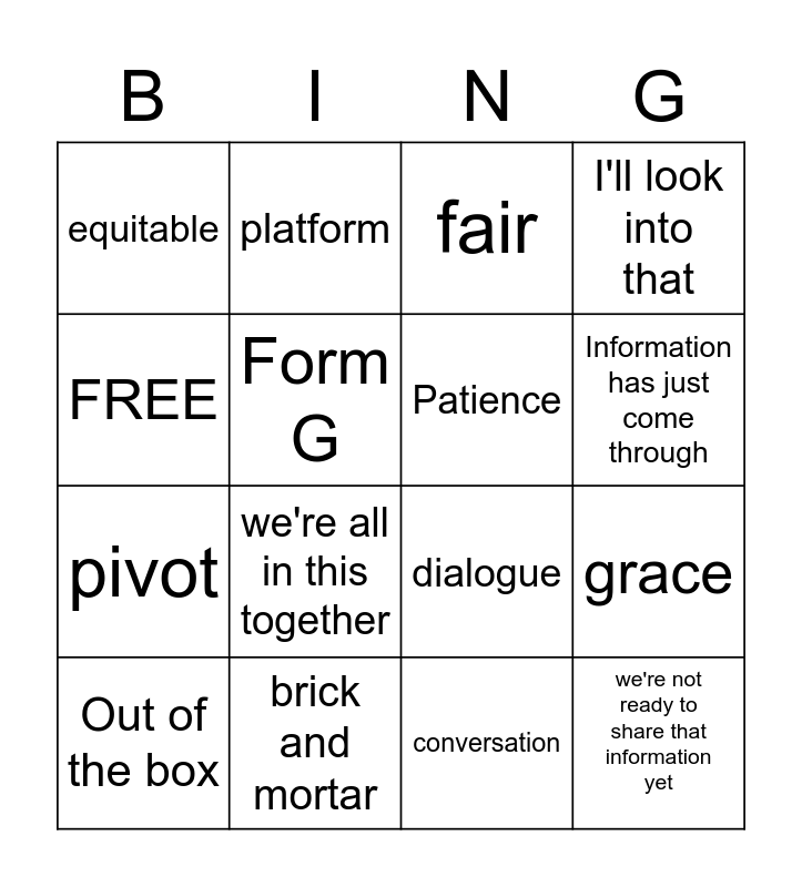 This bingo card has 16 words: brick and mortar, grace, fair, equitable, pivot, platform, dialogue, conversation, FREE, Form G, Out of the box, I'll look into that, we're all in this together, Information has just come through, Patience and we're not ready to share that information yet.