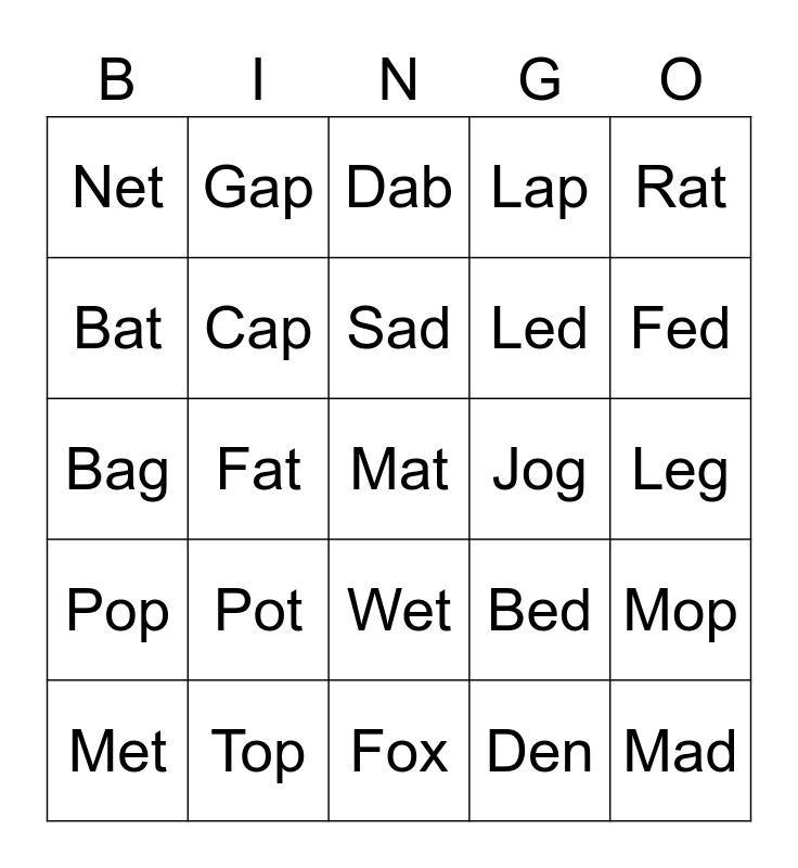 This bingo card has 77 words: Free!, Cab, Dab, Gab, Jab, Lab, Bad, Dad, Had, Lad, Mad, Pad, Sad, Bat, Cat, Fat, Hat, Mat, Pat, Rat, Sat, Bag, Cap, Gap, Lap, Map, Nap, Rap, Gal, Pal, Yak, Wax, Tax, Bed, Fed, Led, Red, Beg, Leg, Den, Hen, Pen, Bet, Get, Jet, Let, Met, Net, Pet, Set, Vet, Wet, Yet, Cot, Dot, Got, Hot, Jog, Lot, Not, Pot, Rot, Cob, Cop, Hop, Fog, Hog, Jog, Log, Cop, Hop, Mop, Pop, Top, Box, Fox and Pox.