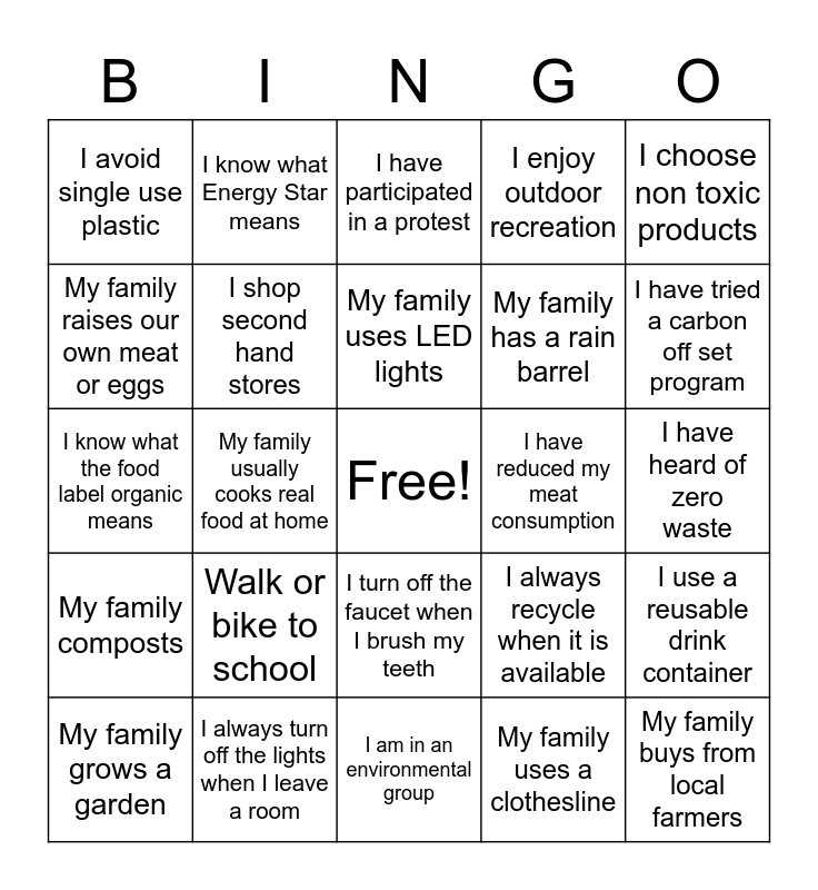 This bingo card has a free space and 25 words: Walk or bike to school, I am in an environmental group, My family uses LED lights, My family grows a garden, I choose non toxic products, I avoid single use plastic, My family raises our own meat or eggs, I know what Energy Star means, I have reduced my meat consumption, I turn off the faucet when I brush my teeth, My family has a rain barrel, I know what the food label organic means, I always recycle when it is available, I use a reusable drink container, I shop second hand stores, I have planted a tree, I have heard of zero waste, I have participated in a protest, I have tried a carbon off set program, My family usually cooks real food at home, My family buys from local farmers, I always turn off the lights when I leave a room, My family composts, I enjoy outdoor recreation and My family uses a clothesline.