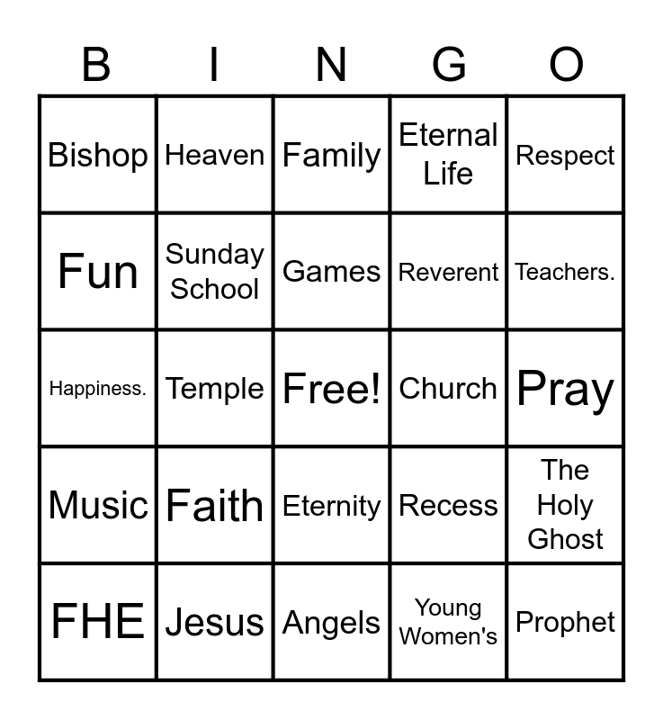 This bingo card has a free space and 24 words: Faith, Jesus, Games, FHE, Respect, Bishop, Fun, Heaven, Church, Eternity, Reverent, Happiness., Recess, The Holy Ghost, Sunday School, Young Women's, Pray, Family, Teachers., Temple, Prophet, Music, Eternal Life and Angels.