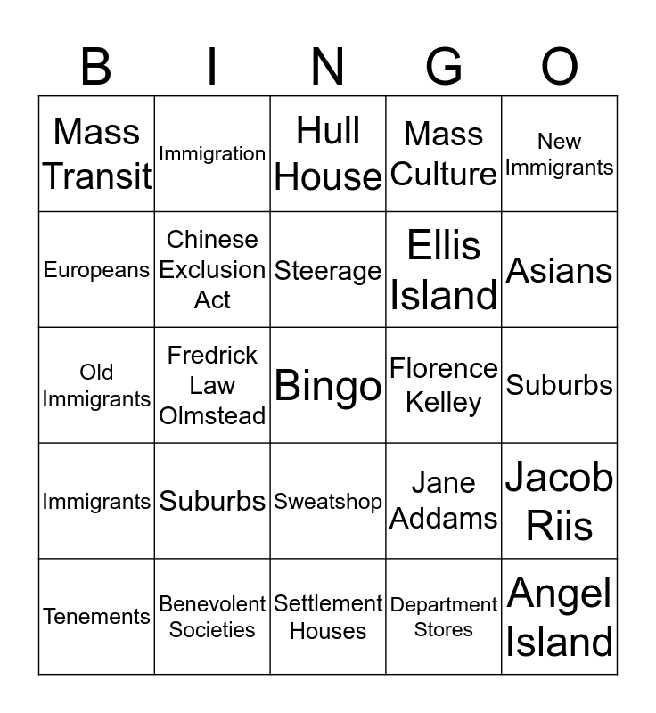 This bingo card has a free space and 24 words: Suburbs, Benevolent Societies, Steerage, Tenements, New Immigrants, Mass Transit, Europeans, Immigration, Florence Kelley, Sweatshop, Ellis Island, Old Immigrants, Jane Addams, Jacob Riis, Chinese Exclusion Act, Department Stores, Suburbs, Hull House, Asians, Fredrick Law Olmstead, Angel Island, Immigrants, Mass Culture and Settlement Houses.