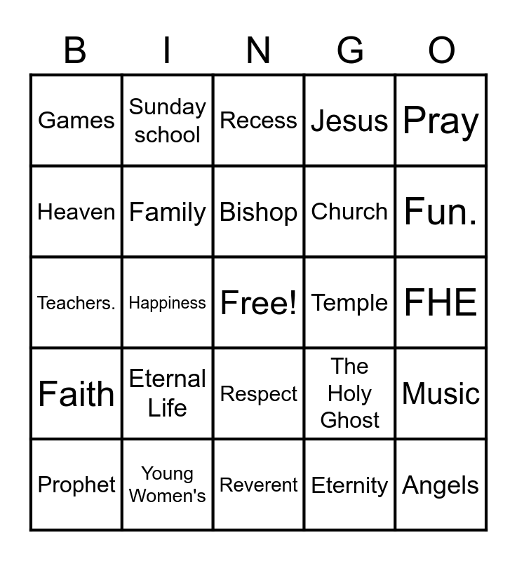 This bingo card has a free space and 24 words: Eternal Life, Young Women's, Bishop, Prophet, Pray, Games, Heaven, Sunday school, Temple, Respect, Church, Teachers., The Holy Ghost, Music, Family, Eternity, FHE, Recess, Fun., Happiness, Angels, Faith, Jesus and Reverent.