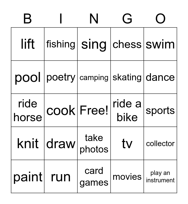 This bingo card has a free space and 24 words: draw, run, camping, paint, swim, lift, pool, fishing, ride a bike, take photos, skating, ride horse, tv, collector, poetry, movies, sports, sing, dance, cook, play an instrument, knit, chess and card games.