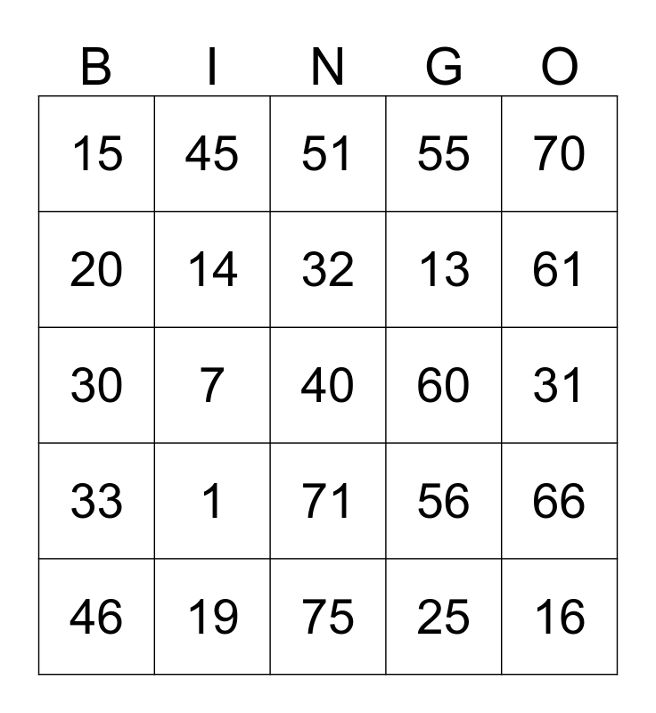 This bingo card has a free space and 24 words: 1, 19, 32, 46, 70, 15, 20, 45, 60, 71, 13, 30, 56, 66, 14, 25, 31, 51, 61, 7, 16, 33, 55 and 75.