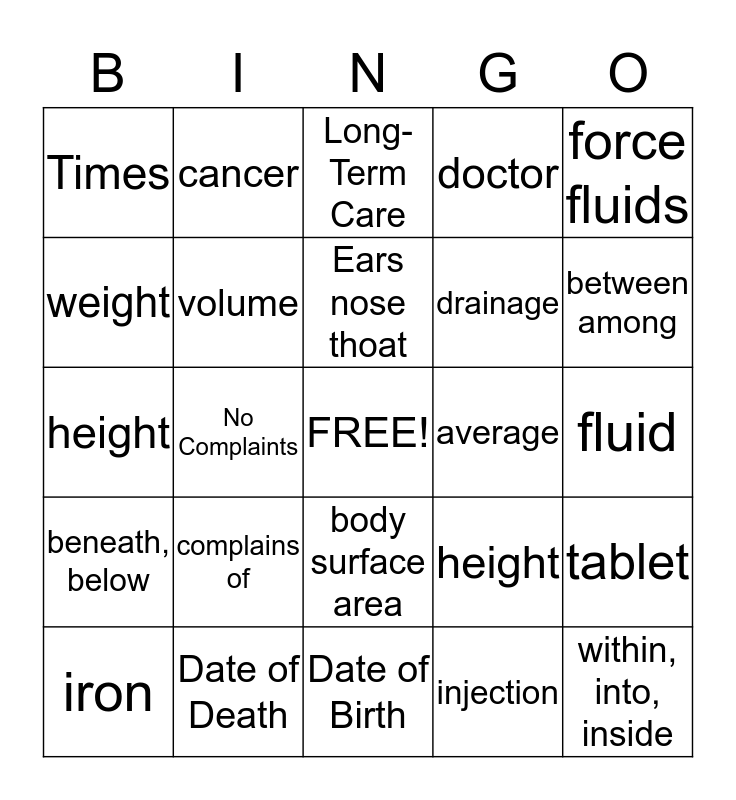 This bingo card has a free space and 24 words: complains of, Date of Death, Ears nose thoat, iron, force fluids, Times, weight, cancer, average, body surface area, drainage, height, height, tablet, volume, injection, fluid, Long-Term Care, between among, No Complaints, within, into, inside, beneath, below, doctor and Date of Birth.