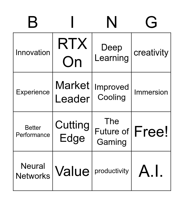 This bingo card has 20 words: Free!, Tensor Cores, Deep Learning, Raytracing, Neural Networks, Experience, Value, Innovation, Better Performance, RTX On, Cutting Edge, The Future of Gaming, Market Leader, A.I., Improved Cooling, RGB, Immersion, creativity, productivity and Minecraft RTX.