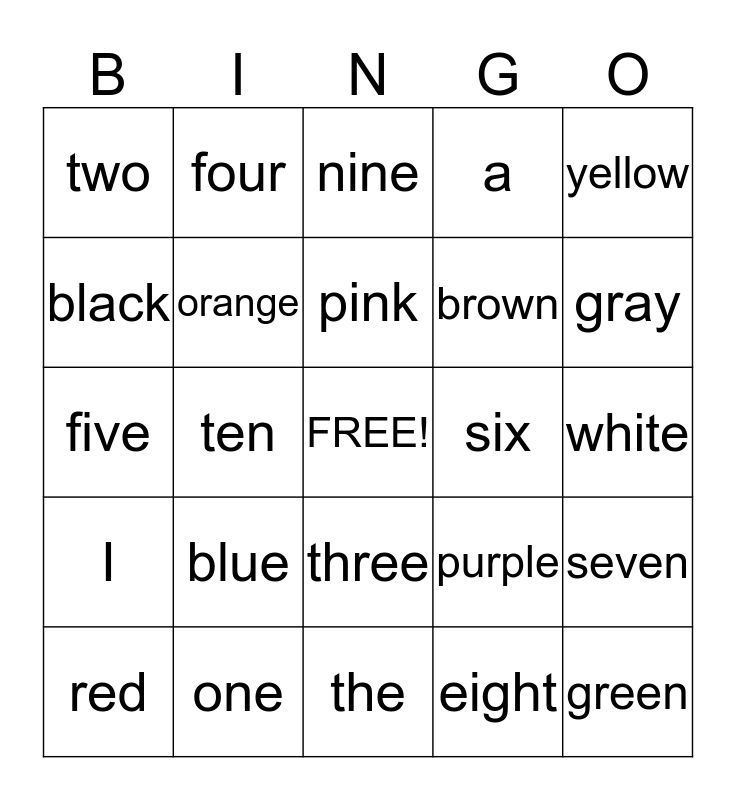 This bingo card has a free space and 24 words: blue, one, pink, red, yellow, two, black, four, six, three, brown, five, purple, seven, orange, eight, white, nine, gray, ten, green, I, a and the.
