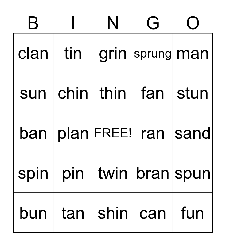 This bingo card has a free space and 24 words: pin, tan, thin, bun, man, clan, sun, tin, ran, twin, fan, ban, bran, spun, chin, can, sand, grin, stun, plan, fun, spin, sprung and shin.