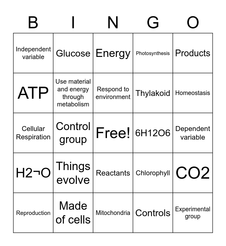 This bingo card has a free space and 27 words: Chlorophyll, Chloroplast, Thylakoid, Mitochondria, ATP, Energy, Glucose, H2¬O, 6H12O6, CO2, Cellular Respiration, Photosynthesis, Reproduction, Made of cells, Homeostasis, Growth and Development, Use material and energy through metabolism, Respond to environment, Things evolve, Independent variable, Dependent variable, Controls, Control group, Experimental group, Reactants, Products and The Sun.