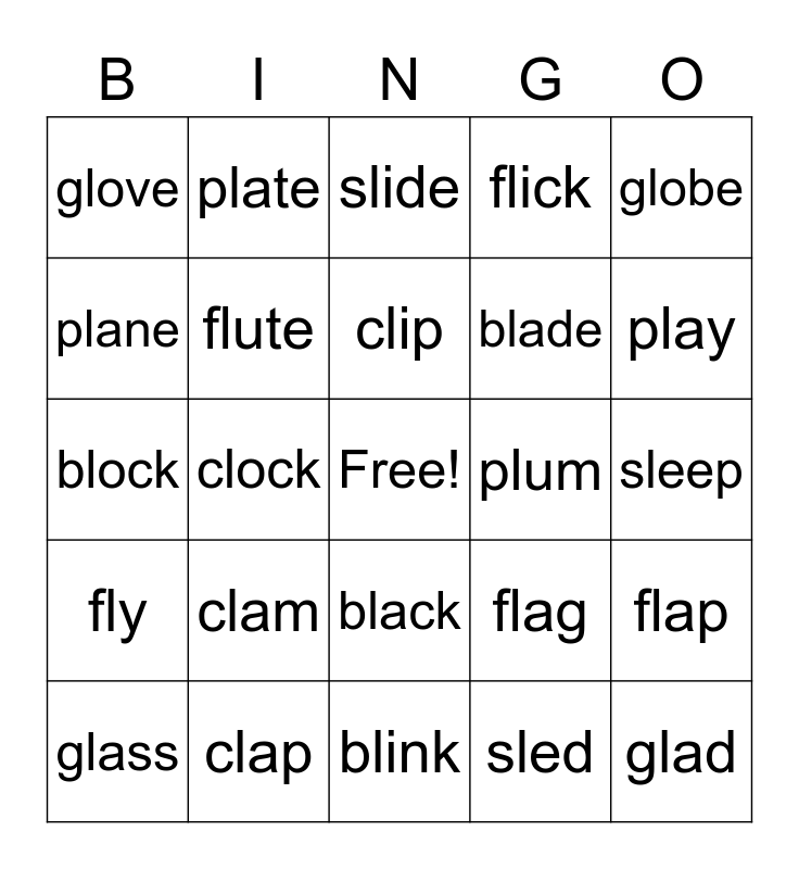 This bingo card has a free space and 24 words: clam, clap, clip, glass, globe, glove, plane, plate, plum, black, blade, block, flag, flap, flute, sled, sleep, slide, play, clock, glad, fly, flick and blink.