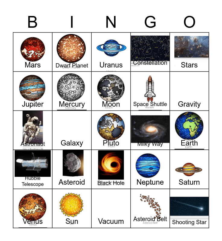 This bingo card has 21 images, a free space and 24 words: Asteroid, Sun, Moon, Venus, Stars, Mars, Jupiter, Dwarf Planet, Milky Way, Black Hole, Space Shuttle, Astronaut, Neptune, Saturn, Mercury, Asteroid Belt, Earth, Uranus, Gravity, Galaxy, Shooting Star, Hubble Telescope, Constellation and Vacuum.
