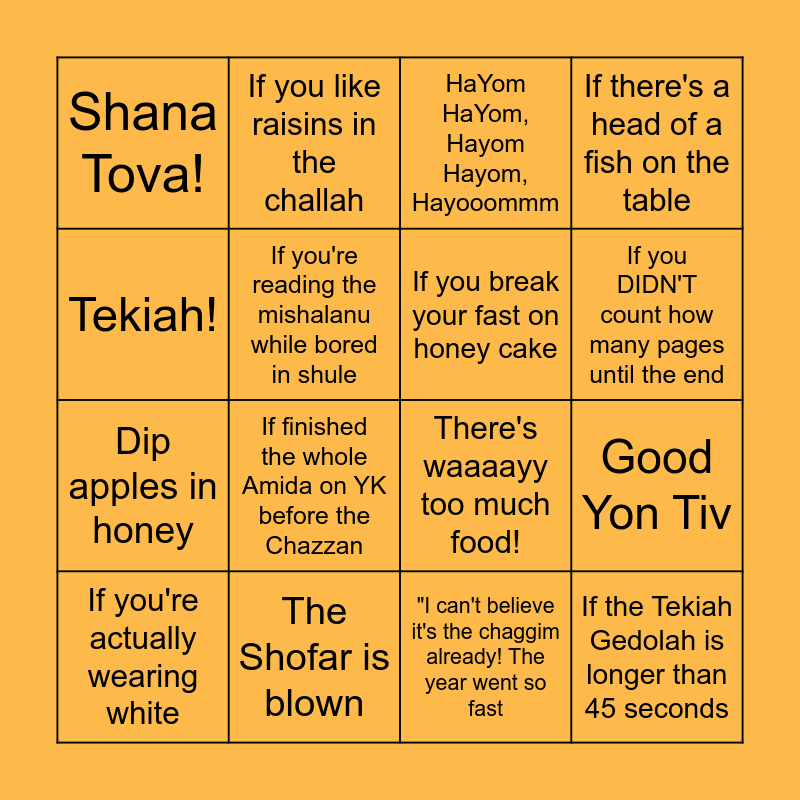 This bingo card has 16 words: The Shofar is blown, Good Yon Tiv, HaYom HaYom, Hayom Hayom, Hayooommm, Shana Tova!, Dip apples in honey, If you like raisins in the challah, There's waaaayy too much food!, "I can't believe it's the chaggim already! The year went so fast, Tekiah!, If you're reading the mishalanu while bored in shule, If you're actually wearing white, If there's a head of a fish on the table, If finished the whole Amida on YK before the Chazzan, If you DIDN'T count how many pages until the end, If you break your fast on honey cake and If the Tekiah Gedolah is longer than 45 seconds.