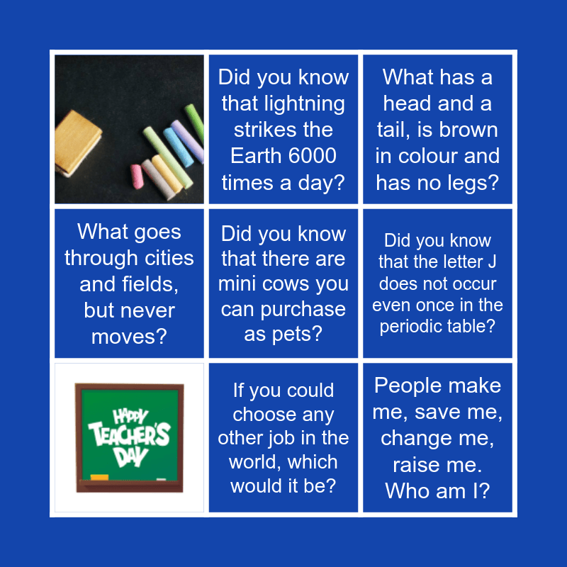 This bingo card has 2 images and 7 words: What has a head and a tail, is brown in colour and has no legs?, Did you know that lightning strikes the Earth 6000 times a day?, What goes through cities and fields, but never moves?, Did you know that the letter J does not occur even once in the periodic table?, Did you know that there are mini cows you can purchase as pets?, People make me, save me, change me, raise me. Who am I? and If you could choose any other job in the world, which would it be?.