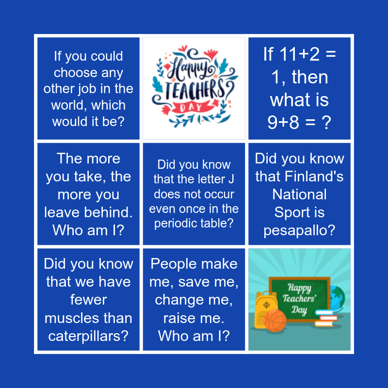 This bingo card has 2 images and 7 words: Did you know that we have fewer muscles than caterpillars?, If 11+2 = 1, then what is 9+8 = ?, The more you take, the more you leave behind. Who am I?, If you could choose any other job in the world, which would it be?, Did you know that Finland's National Sport is pesapallo?, Did you know that the letter J does not occur even once in the periodic table? and People make me, save me, change me, raise me. Who am I?.
