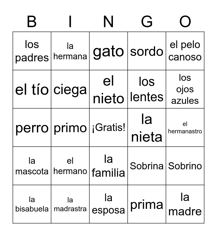 This bingo card has a free space and 49 words: el padre, la madre, el esposo, la esposa, el hermano, el hijo, la hermana, la hija, el tío, la tía, ciega, sordo, Sobrino, Sobrina, el abuelo, la abuela, el nieto, la nieta, el pelo largo, el pelo canoso, primo, prima, los padres, los lentes, el pelo corto, los ojos azules, la bisabuela, el bisabuelo, la familia, la mascota, los sobrinos, las hijas, los hijos, los hermanos, la madrastra, el padrastro, la cuñada, el cuñado, el hermanastro, la hermanastra, los nietos, callado, delgado, viejo, perro, gato, pez, gordo and joven.