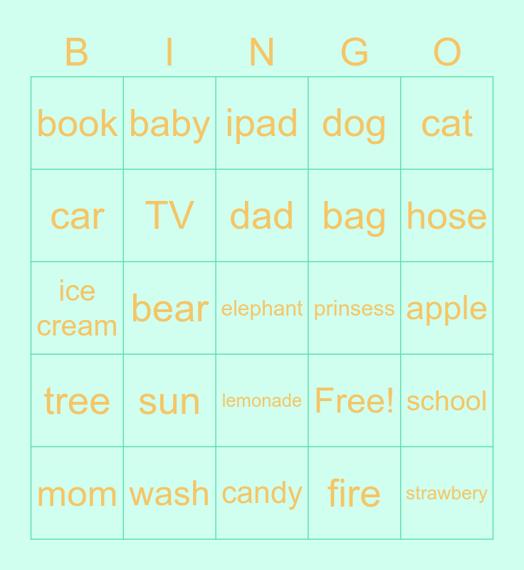 This bingo card has 25 words: sun, candy, dad, mom, cat, book, car, baby, prinsess, lemonade, bag, ice cream, Free!, school, TV, strawbery, apple, ipad, hose, bear, elephant, wash, tree, dog and fire.