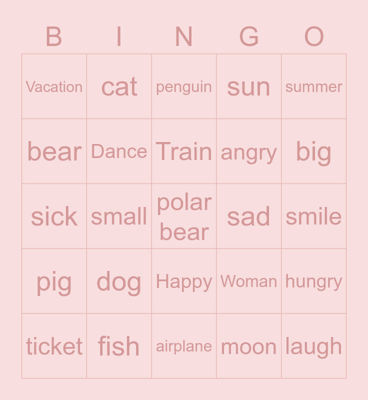 This bingo card has 25 words: dog, airplane, Train, ticket, summer, Vacation, bear, cat, sad, Happy, angry, sick, Woman, hungry, Dance, laugh, smile, penguin, big, small, polar bear, fish, pig, sun and moon.