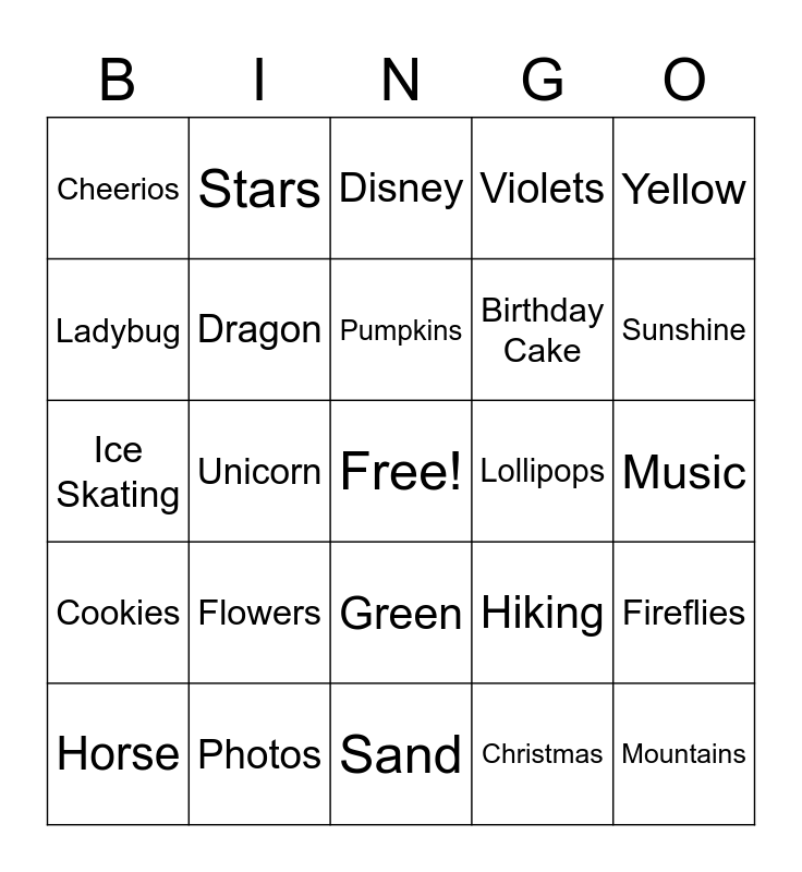 This bingo card has a free space and 29 words: Horse, Llama, Unicorn, Popcorn, Cheerios, Disney, Dragon, Flowers, Lollipops, Photos, Music, Mountains, Sand, Christmas, Sunshine, Raindrops, Green, Cookies, Yellow, Ice Skating, Hiking, Saturday, Birthday Cake, Ladybug, Violets, Stars, Fireflies, Pumpkins and Autumn.