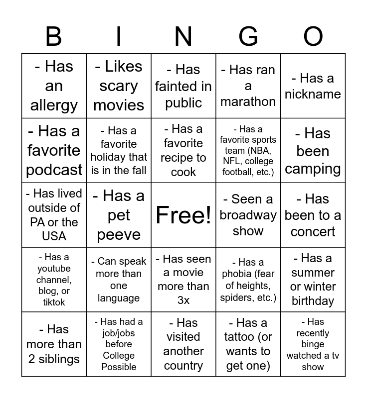 This bingo card has a free space and 25 words: - Can speak more than one language, - Has visited another country, - Has a favorite recipe to cook, - Has more than 2 siblings, - Has a nickname, - Has an allergy, - Has a favorite podcast, - Likes scary movies, - Seen a broadway show, - Has seen a movie more than 3x, - Has a favorite sports team (NBA, NFL, college football, etc.), - Has lived outside of PA or the USA, - Has a phobia (fear of heights, spiders, etc.), - Has a summer or winter birthday, - Has a favorite holiday that is in the fall, - Has had stitches or broken a bone, - Has been to a concert, - Has fainted in public, - Has been camping, - Has a pet peeve, - Has recently binge watched a tv show, - Has had a job/jobs before College Possible, - Has a youtube channel, blog, or tiktok, - Has ran a marathon and - Has a tattoo (or wants to get one).