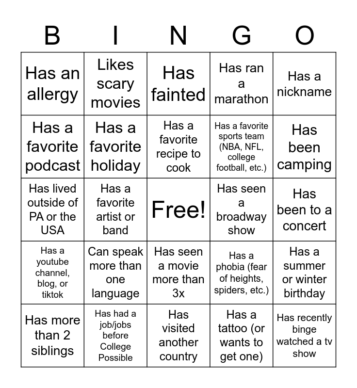This bingo card has a free space and 25 words: Can speak more than one language, Has visited another country, Has a favorite recipe to cook, Has more than 2 siblings, Has a nickname, Has an allergy, Has a favorite podcast, Likes scary movies, Has seen a broadway show, Has seen a movie more than 3x, Has a favorite sports team (NBA, NFL, college football, etc.), Has lived outside of PA or the USA, Has a phobia (fear of heights, spiders, etc.), Has a summer or winter birthday, Has a favorite holiday, Has had stitches or broken a bone, Has been to a concert, Has fainted, Has been camping, Has a favorite artist or band, Has recently binge watched a tv show, Has had a job/jobs before College Possible, Has a youtube channel, blog, or tiktok, Has ran a marathon and Has a tattoo (or wants to get one).