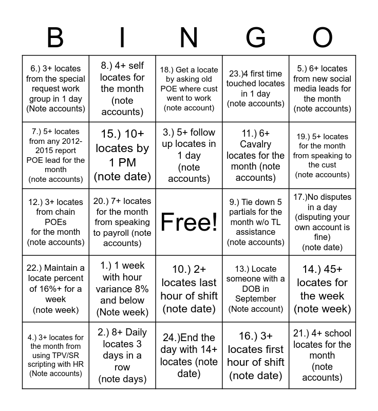This bingo card has a free space and 24 words: 1.) 1 week with hour variance 8% and below (Note week), 2.) 8+ Daily locates 3 days in a row (note days), 3.) 5+ follow up locates in 1 day (note accounts), 4.) 3+ locates for the month from using TPV/SR scripting with HR (Note accounts), 5.) 6+ locates from new social media leads for the month (note accounts), 6.) 3+ locates from the special request work group in 1 day (Note accounts), 7.) 5+ locates from any 2012- 2015 report POE lead for the month (note accounts), 8.) 4+ self locates for the month (note accounts), 9.) Tie down 5 partials for the month w/o TL assistance (note accounts), 10.) 2+ locates last hour of shift (note date), 11.) 6+ Cavalry locates for the month (note accounts), 12.) 3+ locates from chain POEs for the month (note accounts), 13.) Locate someone with a DOB in September (Note account), 14.) 45+ locates for the week (note week), 15.) 10+ locates by 1 PM (note date), 16.) 3+ locates first hour of shift (note date), 17.)No disputes in a day (disputing your own account is fine) (note date), 18.) Get a locate by asking old POE where cust went to work (note account), 19.) 5+ locates for the month from speaking to the cust (note accounts), 20.) 7+ locates for the month from speaking to payroll (note accounts), 21.) 4+ school locates for the month (note accounts), 22.) Maintain a locate percent of 16%+ for a week (note week), 23.)4 first time touched locates in 1 day (note accounts) and 24.)End the day with 14+ locates (note date).