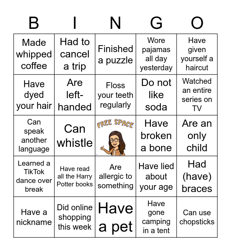 This bingo card has a free space and 29 words: Have a nickname, Play a musical instrument, Can whistle, Skipped breakfast this morning, Made whipped coffee, Finished a puzzle, Are left- handed, Have read all the Harry Potter books, Have broken a bone, Did online shopping this week, Are an only child, Can use chopsticks, Have a pet, Have gone camping in a tent, Watched an entire series on TV, Play video games, Are allergic to something, Learned a TikTok dance over break, Have given yourself a haircut, Can speak another language, Have lied about your age, Don't like pizza, Do not like soda, Have dyed your hair, Wore pajamas all day yesterday, Had to cancel a trip, Had (have) braces, Floss your teeth regularly and Have gotten stitches.