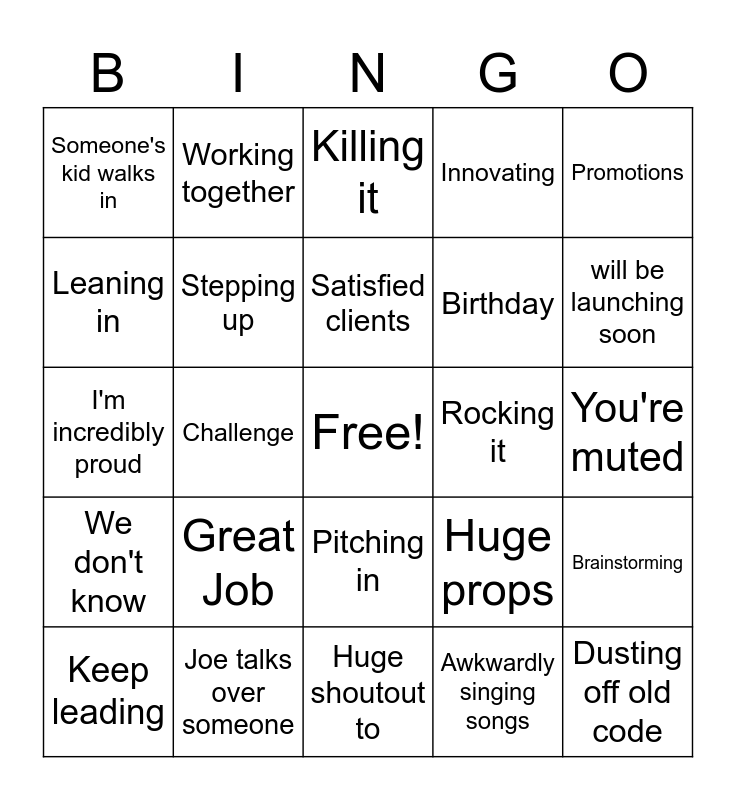 This bingo card has a free space and 28 words: Brainstorming, Revolutionary, Birthday, Awkwardly singing songs, Leaning in, Killing it, Working together, We don't know, Rocking it, Keep leading, I'm incredibly proud, Innovating, Joe talks over someone, Huge shoutout to, will be launching soon, Huge accomplishment, Great Job, Stepping up, Satisfied clients, Pitching in, Someone's kid walks in, Chipping in, Dusting off old code, Challenge, You're muted, Huge props, Promotions and Changing the game.