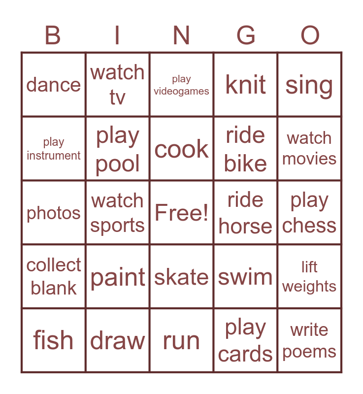 This bingo card has a free space and 24 words: paint, draw, cook, fish, sing, dance, play instrument, watch tv, ride horse, skate, ride bike, photos, swim, lift weights, play pool, play cards, play chess, play videogames, watch movies, watch sports, write poems, collect blank, knit and run.