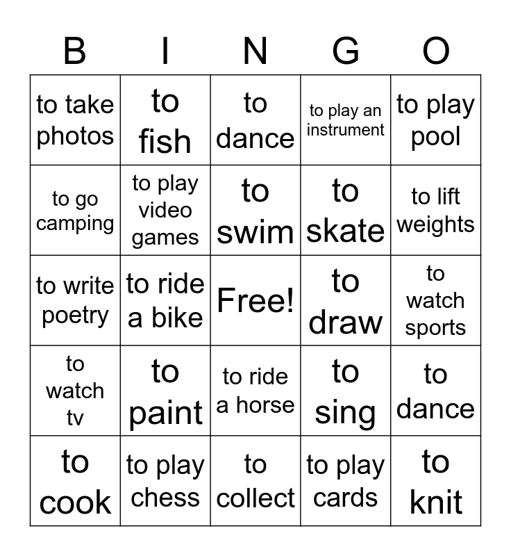 This bingo card has a free space and 24 words: to paint, to play chess, to swim, to cook, to play pool, to take photos, to go camping, to fish, to draw, to ride a horse, to skate, to write poetry, to sing, to dance, to play video games, to play cards, to watch sports, to dance, to lift weights, to ride a bike, to knit, to watch tv, to play an instrument and to collect.