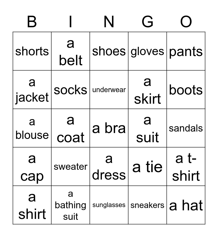 This bingo card has a free space and 24 words: sweater, a bathing suit, underwear, a shirt, pants, shorts, a jacket, a belt, a suit, a dress, a skirt, a blouse, a tie, a t-shirt, socks, sneakers, sandals, shoes, boots, a coat, a hat, a cap, gloves and sunglasses.