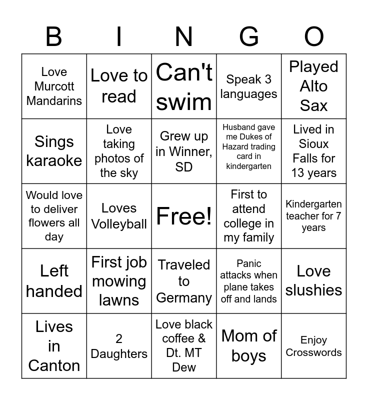 This bingo card has a free space and 54 words: Canadian & American dual citizen, Left handed, Homeschooled through 9th grade, Can't stand ketchup, Traveled to Germany, From Haiti, Speak 3 languages, 19 Siblings, Sings karaoke, Libra, Love Murcott Mandarins, 13 years with WF, 2 Daughters, Lives in Canton, 2 Siblings, Love black coffee & Dt. MT Dew, Enjoy Crosswords, Husband gave me Dukes of Hazard trading card in kindergarten, Retired hog wrestler, Kindergarten teacher for 7 years, Panic attacks when plane takes off and lands, Empty Nester who loves wine and books, First to attend college in my family, Played Alto Sax, Has 4 siblings, Love to read, Allergic to shellfish, Married my high school sweetheart, Have 15 chickens, Mom of boys, Love to cook and bake, Am Adopted, Married my husband twice, Travels to two other continents, Can't swim, Favorite colors navy blue and olive green, Would love to deliver flowers all day, Love slushies, Grandson Zeppelin, Love taking photos of the sky, Favorite cereal is Grapenuts, Had 13 surgeries, Love to write, Have 4 tattoos, First job mowing lawns, Brother is shorter than me, Spent summers in Wyoming, 4 WF employees in neighborhood, Grew up in Winner, SD, Loves Volleyball, Lived in Sioux Falls for 13 years, Pasta is my favorite, Husband Taylor Taylor and Daughter Avery.