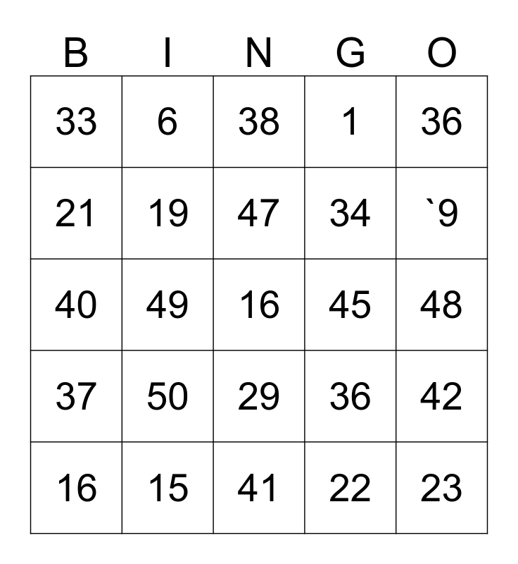 This bingo card has a free space and 24 words: 50, 15, 47, 16, 36, 33, 21, 6, 45, 29, 34, 40, 36, 42, 19, 22, 48, 38, `9, 49, 23, 37, 1 and 41.