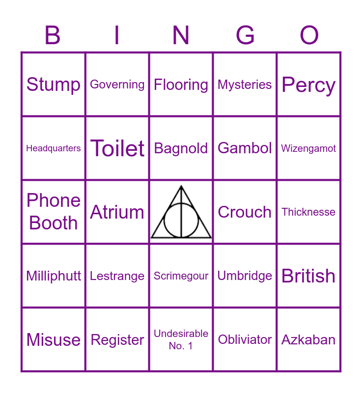 This bingo card has a free space and 63 words: Ministry, Magic, Minister, British, London, Underground, Governing, M.o.M., Bagnold, Fudge, Scrimegour, Arthur, Thicknesse, Percy, Muggle-Born, Headquarters, Atrium, Stump, Flint, Gambol, Lestrange, Milliphutt, Mysteries, Orpington, Dupont, McPhail, Spavin, Crickerly, Evermonde, McLaird, Fawley, Spencer-Moon, Tuft, Auror, Wizengamot, Misuse, Improper, Obliviator, Muggle, Toilet, Phone Booth, Crouch, Dangerous, Fortescue, Azkaban, Register, Kingsley, Umbridge, Snatcher, Brethren, Order, Undesirable No. 1, Magic is Might, Ulick Gamp, Longbottom, Flooring, Portkey, Apparition, Confederation, Goblin, Beast, Being and Centaur.