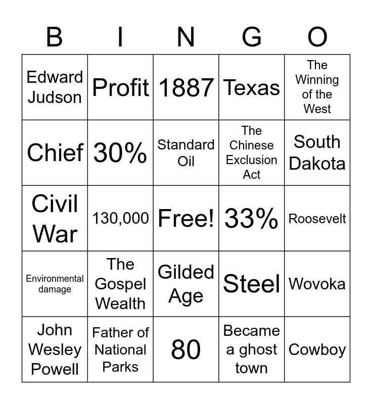 This bingo card has a free space and 28 words: Wovoka, Artist, The Chinese Exclusion Act, Became a ghost town, Chief, 1887, Profit, Environmental damage, 33%, John Wesley Powell, Civil War, Texas, Father of National Parks, 80, South Dakota, Libraries, The Gospel Wealth, 30%, Standard Oil, Gilded Age, Edward Judson, Son of a slave, Cowboy, 130,000, Roosevelt, Steel, The Winning of the West and The Wagon Boss.