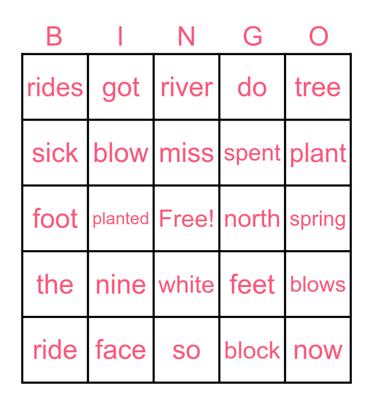 This bingo card has a free space and 24 words: nine, face, miss, ride, tree, rides, sick, got, north, white, spent, foot, feet, blows, blow, block, spring, river, plant, planted, now, the, do and so.