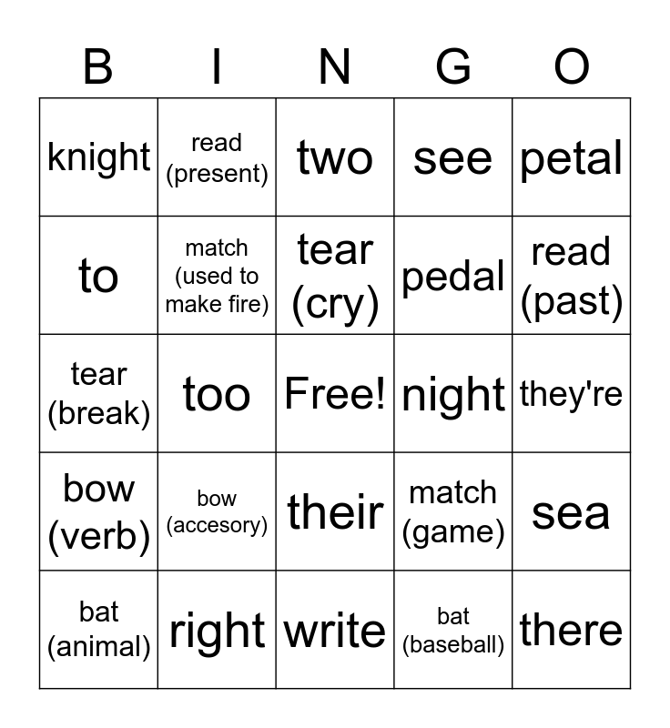 This bingo card has a free space and 24 words: bow (accesory), right, tear (cry), bat (animal), petal, knight, to, read (present), night, their, pedal, tear (break), match (game), sea, match (used to make fire), bat (baseball), they're, two, read (past), too, there, bow (verb), see and write.