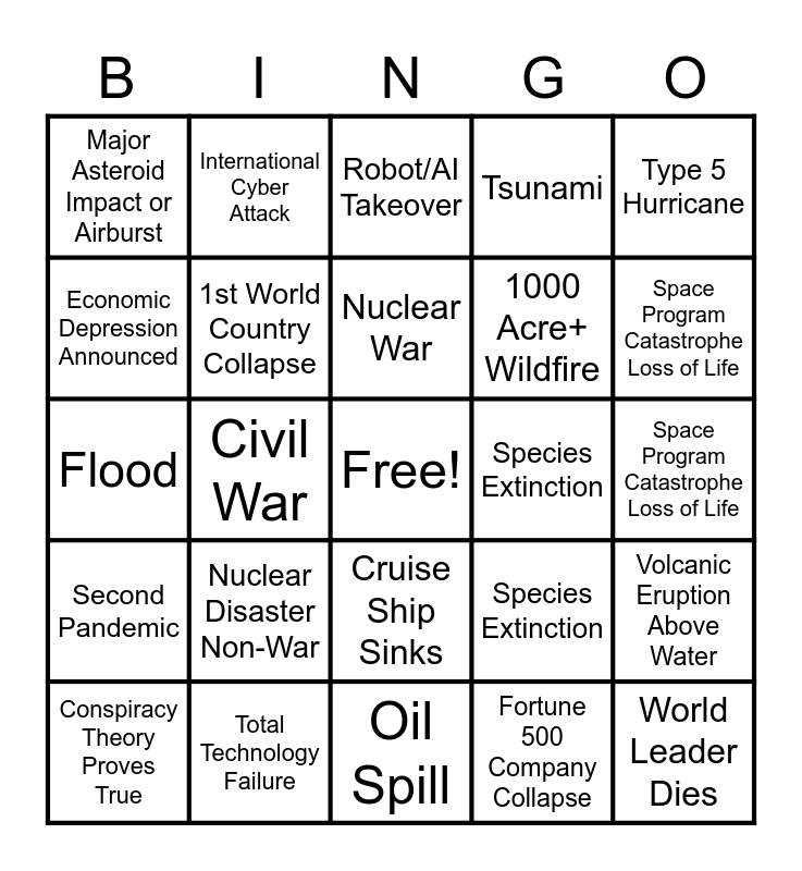 This bingo card has a free space and 30 words: Magnitude 6+ Earthquake, Total Technology Failure, Robot/AI Takeover, Pope Dies, Type 5 Hurricane, Major Asteroid Impact or Airburst, 1st World Country Collapse, Nuclear War, 1000 Acre+ Wildfire, World Leader Dies, Conspiracy Theory Proves True, Nuclear Disaster Non-War, Fortune 500 Company Collapse, Livestock Pestilence, Second Pandemic, Pandemic Announced & Confirmed, Oil Spill, Species Extinction, Volcanic Eruption Above Water, Economic Depression Announced, Civil War, Aliens, Tsunami, Space Program Catastrophe Loss of Life, Flood, International Cyber Attack, Cruise Ship Sinks, Species Extinction, Space Program Catastrophe Loss of Life and Cult Related Murder Suicide.