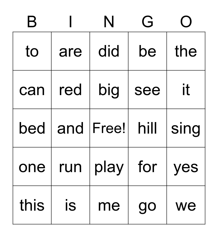This bingo card has a free space and 34 words: dog, go, look, not, one, red, the, this, are, will, big, did, I, a, hill, it, is, bed, run, for, play, am, to, sing, me, we, be, you, see, can, in, and, yes and said.
