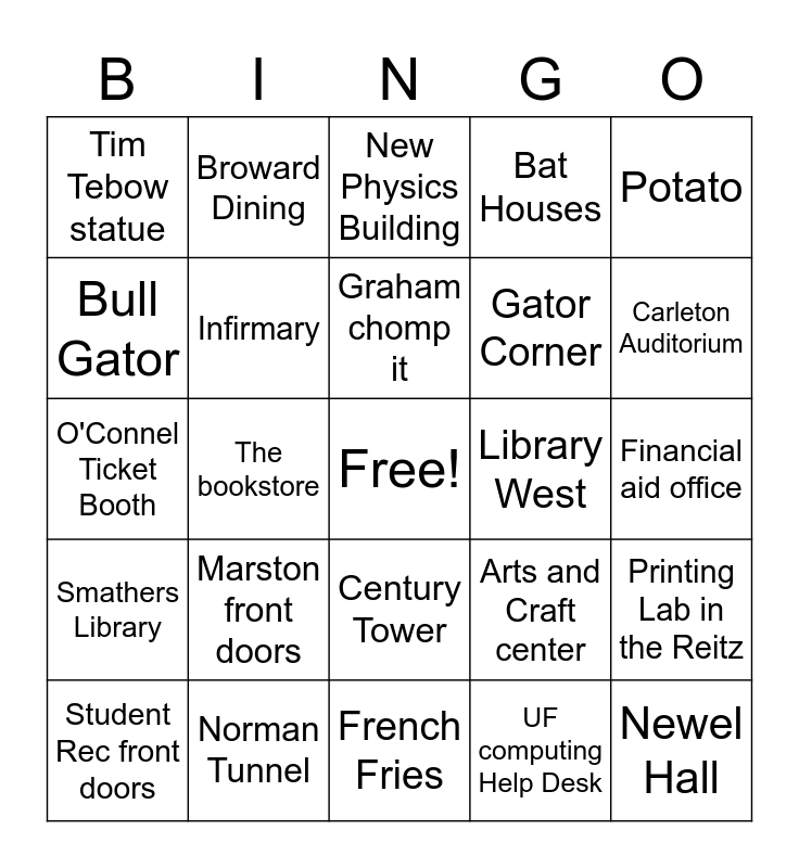 This bingo card has a free space and 25 words: Marston front doors, French Fries, Graham chomp it, Student Rec front doors, Potato, Tim Tebow statue, Bull Gator, Broward Dining, Library West, Century Tower, Gator Corner, O'Connel Ticket Booth, Arts and Craft center, Printing Lab in the Reitz, Infirmary, Music Building, Financial aid office, New Physics Building, Carleton Auditorium, The bookstore, Newel Hall, Norman Tunnel, Smathers Library, Bat Houses and UF computing Help Desk.