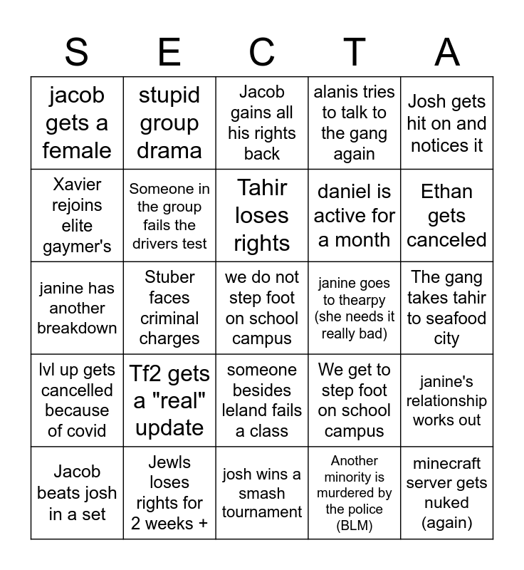 This bingo card has 30 words: Jewls loses rights for 2 weeks +, FULL SQUAD AT JACK IN THE BOX, Stuber faces criminal charges, Huge online cheating scandel, jacob gets a female, Jacob gains all his rights back, Someone in the group fails the drivers test, someone besides leland fails a class, janine goes to thearpy (she needs it really bad), josh wins a smash tournament, The gang takes tahir to seafood city, we do not step foot on school campus, Another minority is murdered by the police (BLM), minecraft server gets nuked (again), Ethan gets canceled, someone in the group gets covid 19, We get to step foot on school campus, lvl up gets cancelled because of covid, Tf2 gets a "real" update, Josh gets hit on and notices it, janine has another breakdown, Nik gets hit on (atleast once), stupid group drama, daniel is active for a month, Xavier rejoins elite gaymer's, alanis tries to talk to the gang again, janine's relationship works out, Jacob beats josh in a set, Tahir loses rights and free space.
