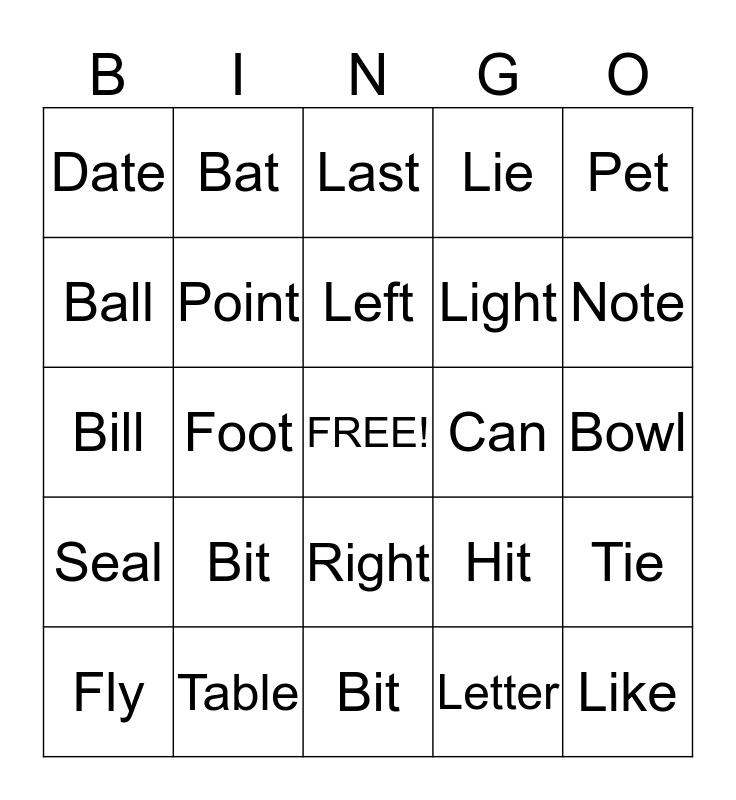 This bingo card has a free space and 24 words: Bit, Table, Left, Fly, Pet, Date, Ball, Bat, Can, Right, Light, Bill, Hit, Tie, Point, Letter, Bowl, Last, Note, Foot, Like, Seal, Lie and Bit.