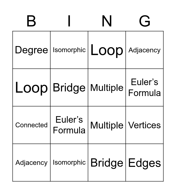 This bingo card has 30 words: Free!, Graph, Vertices, Edges, Degree, Loop, Multiple, Sum, Isomorphic, Connected, Bridge, Adjacency, Planar, Faces, Euler’s Formula, Graph, Vertices, Edges, Degree, Loop, Multiple, Sum, Isomorphic, Connected, Bridge, Adjacency, Planar, Faces, Euler’s Formula and Networks.