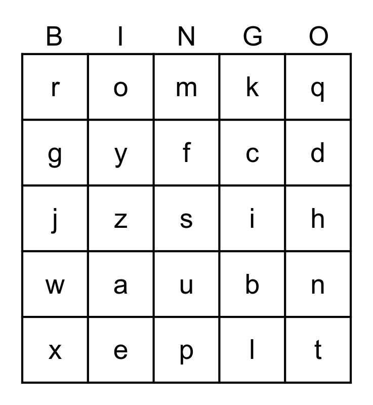 This bingo card has 25 words: a, p, f, x, q, r, g, o, i, u, c, j, b, n, y, t, h, m, d, z, s, e, w, k and l.