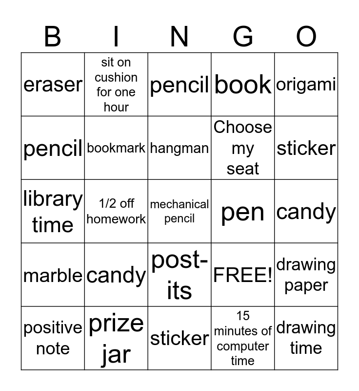 This bingo card has 25 words: candy, sticker, hangman, positive note, origami, eraser, pencil, sit on cushion for one hour, pen, post-its, Choose my seat, library time, FREE!, drawing paper, bookmark, drawing time, candy, pencil, sticker, 1/2 off homework, mechanical pencil, prize jar, marble, book and 15 minutes of computer time.